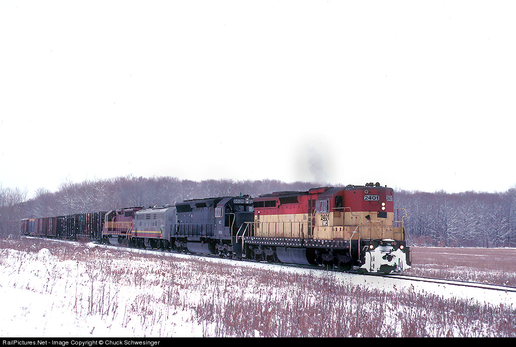 A mix of snow, sleet and freezing rain had been falling all day, but the WC was still up to the challenge with this only on the WC fantastic lash up. 2401,6639,1752 and 3021 have the 75 cars of train SOGBA heading westbound up grade out of Trout Lake. The Ex FRV SD24's found a home in Upper Michigan for a number of years after the WC bought the FRV. No one that ever worked on them was probably sorry to see them go. They both had their own problems. The 2401 was doggy and surely didn't come close to its advertised 2400hp. It also was drafty and the front door needed to be kicked open, as it was hardly possible to get it open any other way. Most crew members just decided it wasn't worth the trouble and exited out the rear door.