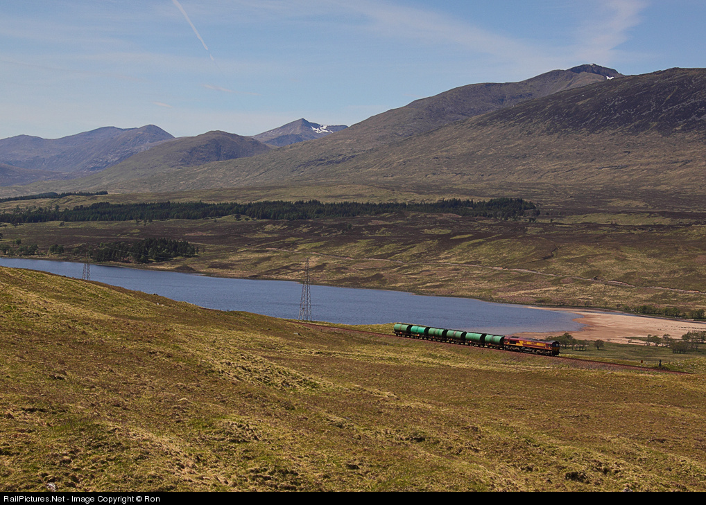| Looking more like a model, the weekly train of fuel oil tanks from Glasgow to Fort William passes the Northern shore of Loch Tulla, deep in the Scottish Highlands, on a glorious early summer afternoon. |