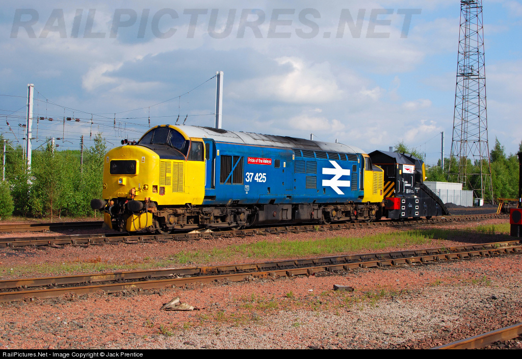 | DB Schenker's 37425 ''Balchder y Cymoedd / Pride of the Valleys'' sits in Mossend Yard (South of Glasgow) awaiting to be shunted on to ballast wagons that were booked to go to Fort William and Glenfinnan (West Highland Line) the next day (31/5) to drop ballast, Unfortionally the class 37 locomotive failed at on route at Glen Douglas due to running out of Engine Coolant which ment RETB fitted 66099 had to drag the train North to Fort William in order for DB Schenker to repair the locomotive so it could work out to Glenfinnan (On the Fort William - Mallaig line) |