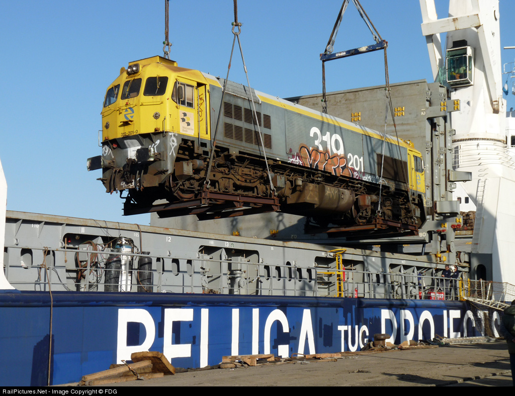 | Landing of locomotives EMD MACOSA J16CW and J26CW bought by the national Argentine government to the Spanish railroads. |