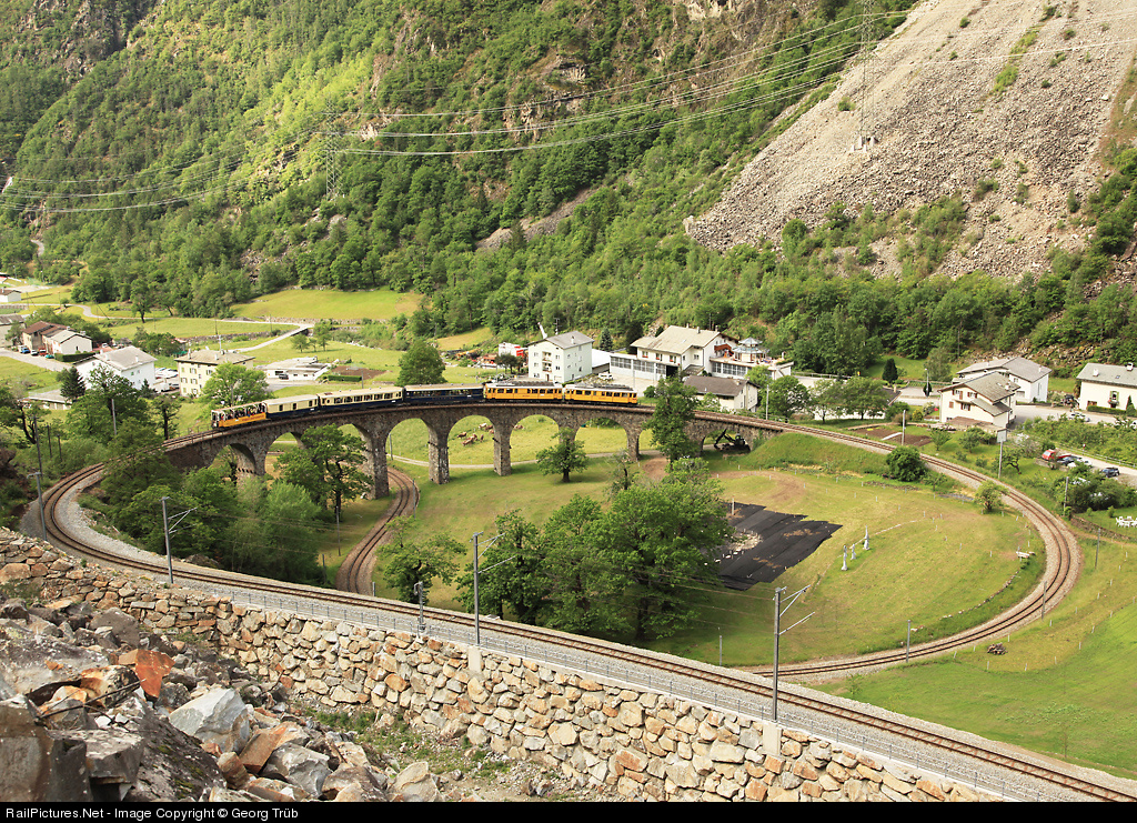 | Special train of the RhB for GdI (Society of Engineers of public transport) is crossing the spiral viaduct between Brusio and Campocologno. On the rear of the train a open top view car. The big dam in the foreground was constructed in 2009, after a landslide had damaged the railway line in decembre 2008, causing a interruption of more then 3 months. The photographer is standing on the rocks of this slide. |