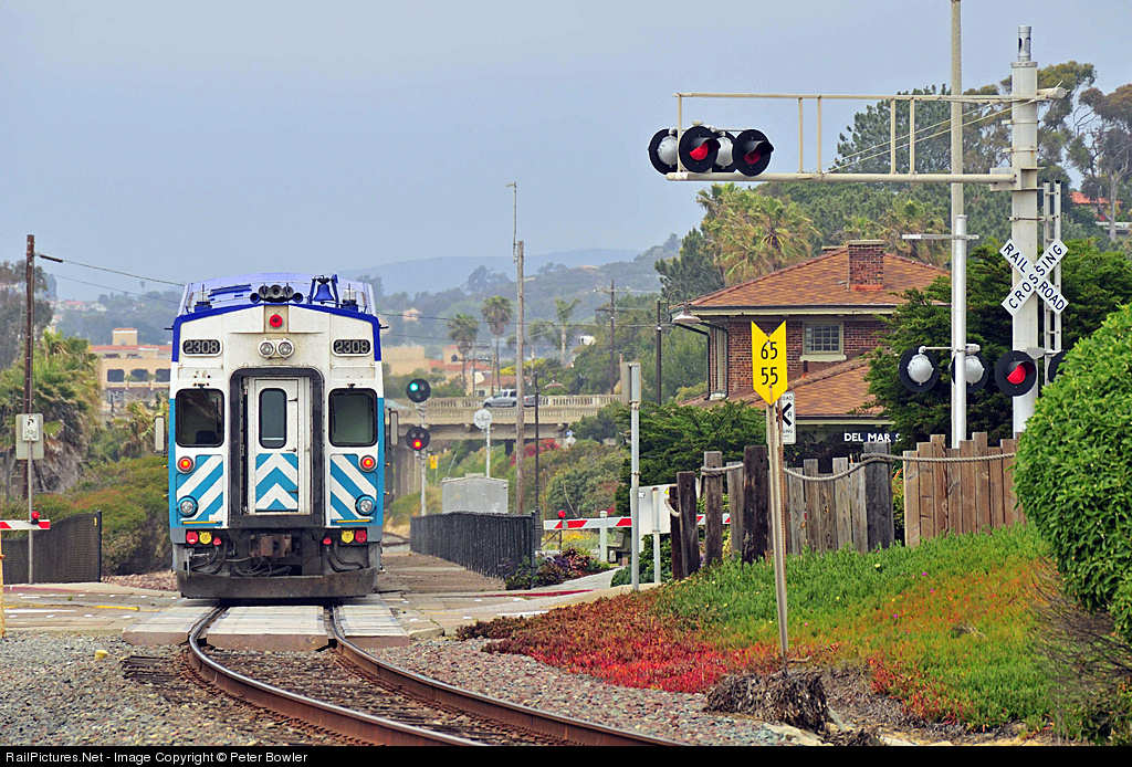 Coaster tail end passes the Delmar Surf Station, former ATSF station, with a green signal indicating clear on the main and red northbound indication for the second station track leading into the Solana Beach station.