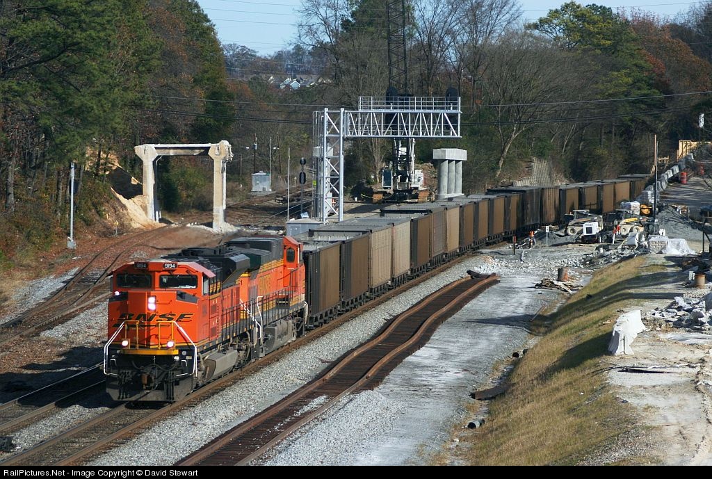 | Not all that often do the BNSF SD70ACes make it to the southeast, but on this day BNSF SD70ACe leads NS empty Schere coal train 733 up the number two main past the control point of Bolton at 14:11. In this scene work continues slowly on Norfolk Southern's Crescent Corridor upgrades. Also in this scene, the remains of the old Hollywood Rd bridge can be seen with peices of the new bridge that will be constructed. |