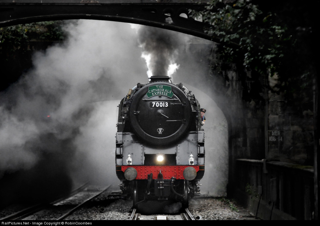 | BR Britannia Pacific No 70013 Oliver Cromwell with a return Cathedrals Express to Lonodon Waterloo passing through a series of bridges and tunnels alongside Sidney Gardens, Bath |