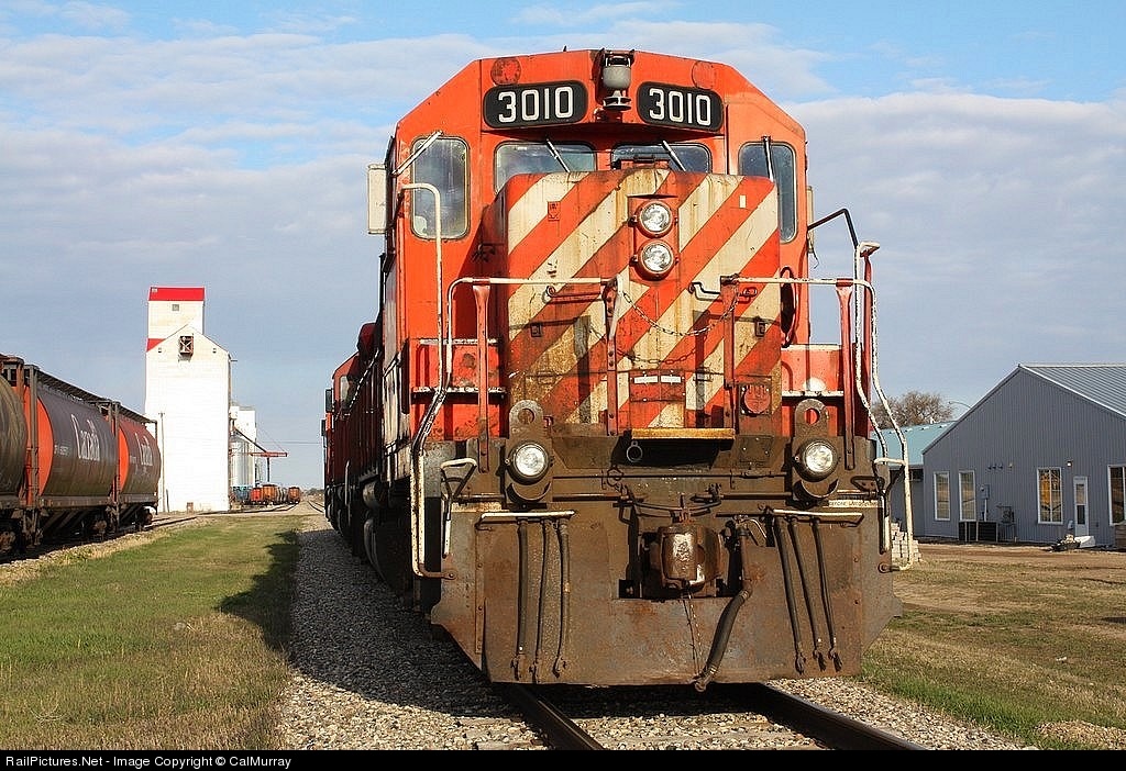 | A rugged old CP 3010 a GP38AC that was built in 1971 sits in Redvers Saskatchewan waiting for a crew to come down to Brandon to pick the units and the cars up. CP P34-07 also has CP 3100 and another GP38AC 3013 in the consist. |