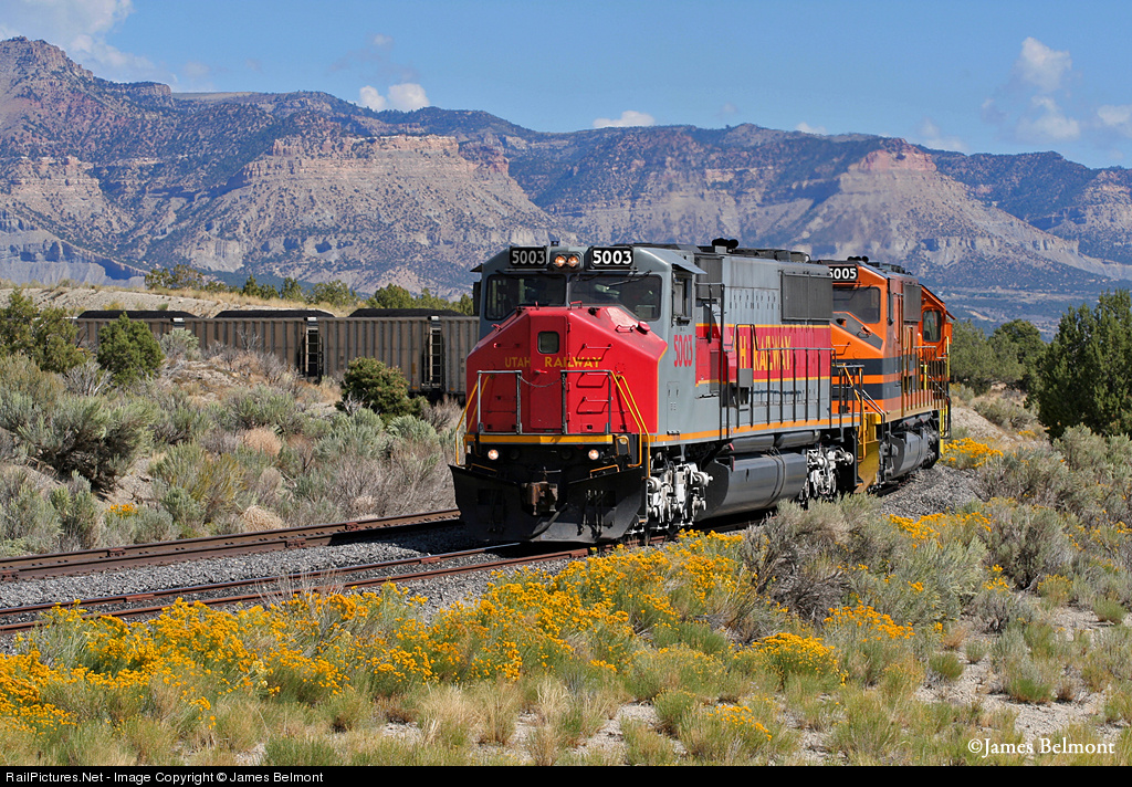 A Utah Railway Intermountain Power coal train creeps slowly around a sharp curve just east of the flood loader at Wildcat, Utah. The Book Cliffs define the background, a range of Cretaceous sandstone cliffs that span more than 200 miles between Helper, Utah and Palisade, Colorado.
