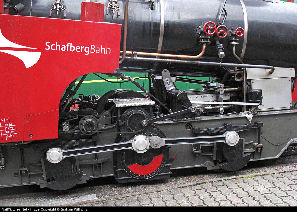 | A close up of the motion/valve gear/cog drive mechanism on Z12, built in 1995, at St.Wolfgang in Austria. See the earlier photo for the technical details of this modern advanced steam locomotive. |