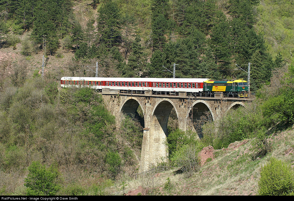 87003-0 passes over the graceful sweeping viaduct spanning the bucolic calm at Bunovo with the first leg of the PTGs three day railtour from Sofia to Varna .
