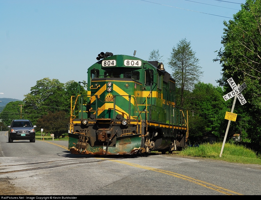 Making the first trip up to the new granite tailings loadout at Graniteville, VT, as light power, GMRC GP9R 804 rolls through the Websterville Road crossing. VRS placed new yellow signs alerting motorists to the fact that increased rail traffic is to commence on June 1, 2010.