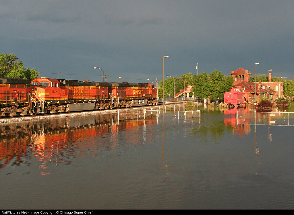 >, a slow-moving train finally finds its way through a raised roadbed (although there is still standing water even between the two lines), passing a partly submerged AT&SF museum.