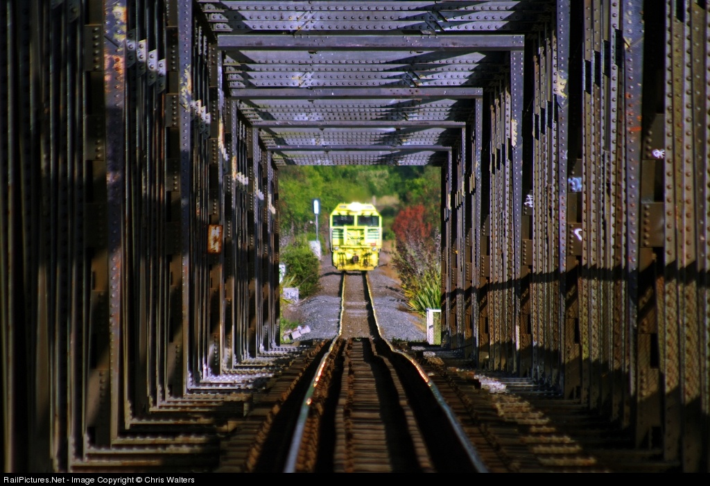 A view peering down the Matapihi railway bridge from the Tauranga side, as DXR8007 approaches from the eastern end. This image was captured from the walkway on the southern side of the bridge, on the curve at the western end of the structure.