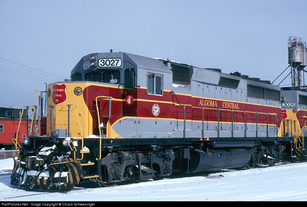 | WC 3027 at Steelton Shops in Sault Ste. Marie, ON. The ACR had bought the two GP40's a year or so before for use on the Agawa Canyon tour trains. The WC left them on that assignment for awhile after the merger, but before long they were in system wide freight service. |