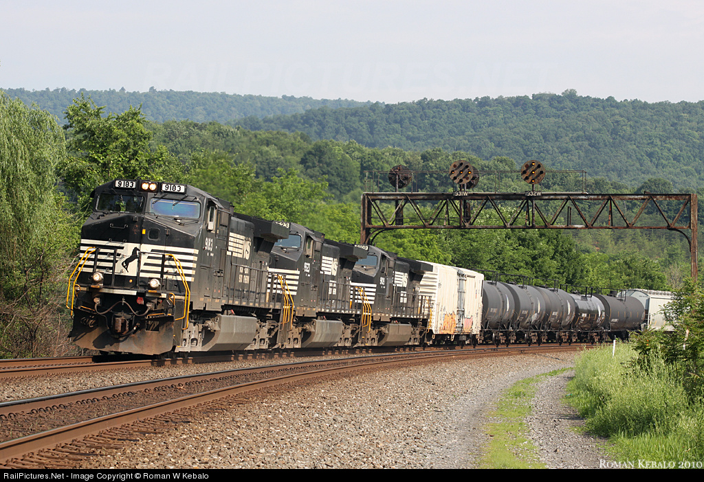 | Old Symbol, New Train! The NS symbol 12N was eliminated in late 2008 with the closing of the Chrysler auto plant in Delaware. With traffic continuing to increase in 2010, the symbol was recycled into a new Bellevue OH to Allentown PA manifest train. Still less than a week old, a new 12N is seen here with a Dash 9 trio passing under an old PRR signal bridge at Mapleton PA... |