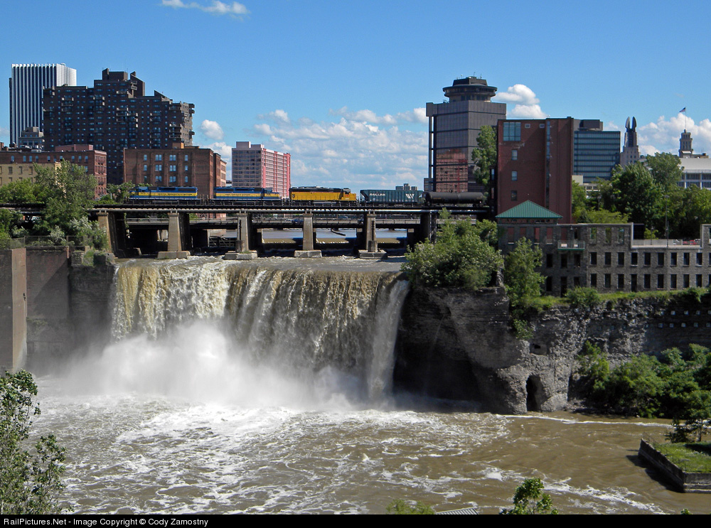 A trio of SD40-2's from DME, ICE and CITX pose atop High Falls and affront the towering structures of downtown Rochester.