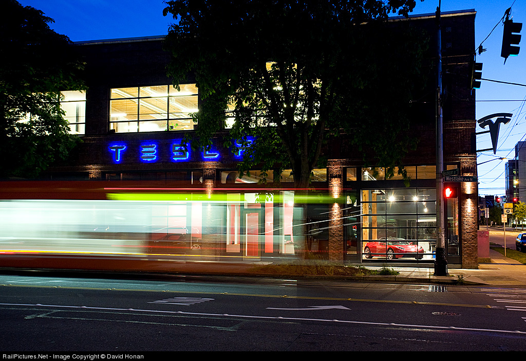 | Electric train, meet electric car: A Downtown-bound streetcar hums past the Tesla showroom in Seattle's developing South Lake Union neighborhood, where one can give the speedy all-electric Roadster a test drive. |