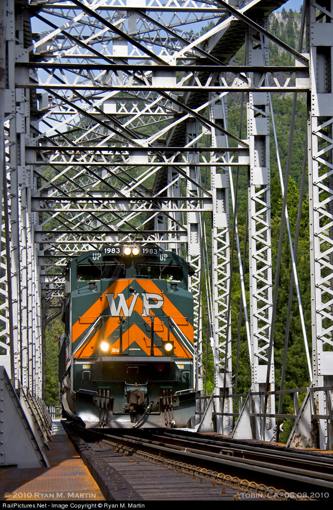 The Dunsmuir-bound Feathered UP Heritage Unit does its best to represent the Feathered River Canyon crossing over the bridge at Tobin.
