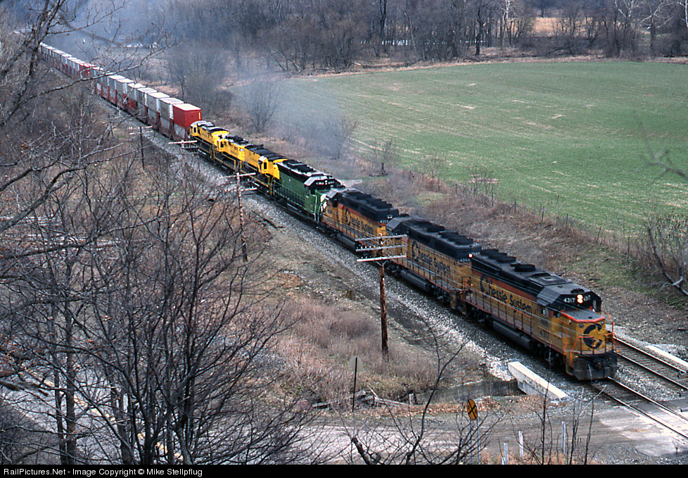 The Westbound Sealand stack train has a colorful mix of Chessie & NYSW power. This trains power shows what "could have been" if Chessie had gotten the ex EL trackage when CR was created as was originally planned.