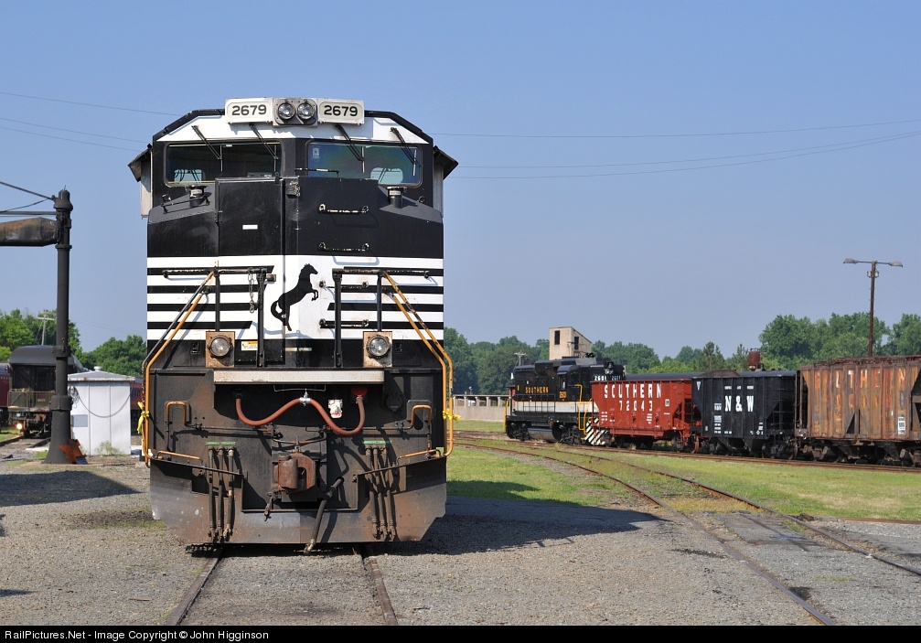 | Each year, NS sends a few locomotives for display at NCTM's Rail Days, and this year the 2679 was one of them. The modern EMD seems out of place as former SOU GP30 2601 switches vintage freight cars nearby. |