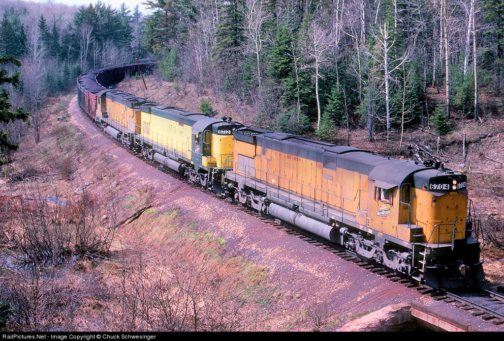 | CNW 6704,6712,6702 have 105 loads on the roll at Partridge. This was the C628's last spring in ore service and they probably were the last Century's operating for a major RR in the US. A few had been repainted a year or so before this photo, as can be seen on the trailing 6712. The leader on today's train no doubt is wearing the same coat of paint CNW applied not long after buying unit from N&W 13 years earlier. |