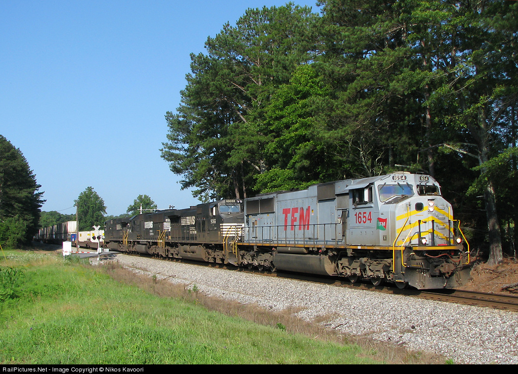 | TFM 1654 roars through the rural Georgia countryside. The Mexican visitor was added on the trains journey through KCS territory after the trash 9 third out failed providing us with another chance to shoot a TFM, which has become rare. Here the train highballs south just east of Vila Rica, with a hogger that would have the train in our rear view mirror all the way to Austell. |