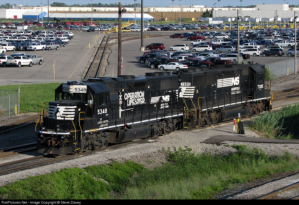 Norfolk Southern 5348 and 7085 are at Sterling Yard between assignments near the 17 Mile Road overpass. The adjacent Chrysler assembly plant yard is in the background where autos are loaded into rail cars.