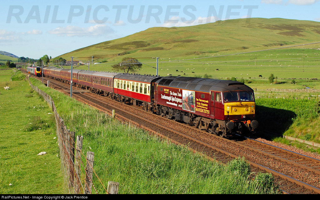 | WCRC's 47826 complete with Scarborough Spa Express advert on the side returns South past Wandel (Near Abington) with the 1Z71 Gourock - Alnmouth railtour which ran via Carstairs & the WCML then over via Hexham |