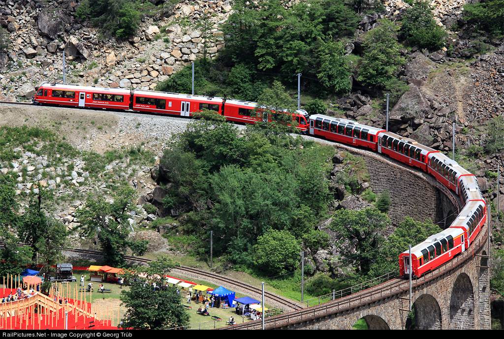 | New Allegra trainset ABe 8/12 3503 "Carlo Janka" is pulling the Bernina Express Tirano-St.Moritz-Davos over the Brusio spiral viaduct on the day of the anniversary celebrations. |