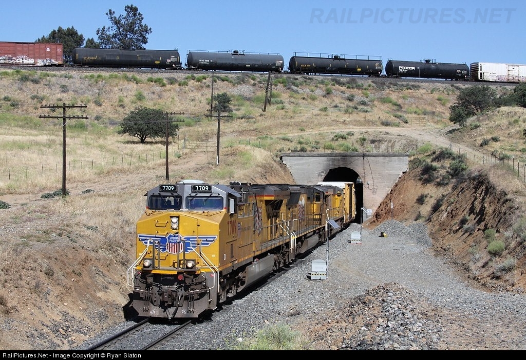 | UP 7709 emerges from the west portal of Tunnel 9 with the MWCFR 25, as its train passes over top of the power on the world famous Tehachapi Loop. |
