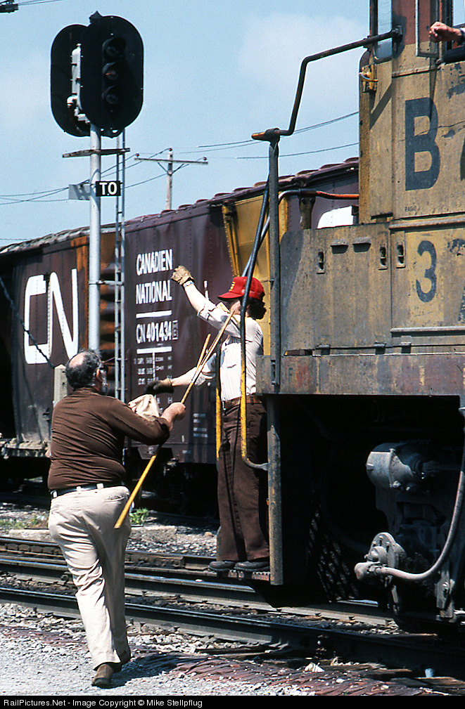 The operator at the LeRoy station hoops up some orders and a brown bag to the headend brakeman of RS-97.