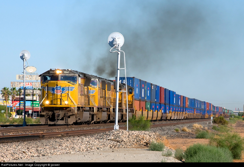 Eastbound UP 3860 and its brethren, pulling a double stack, power up on the main line after waiting for another train to move to track #2, on a clear morning in Arizona that will reach 110 degrees at this location.