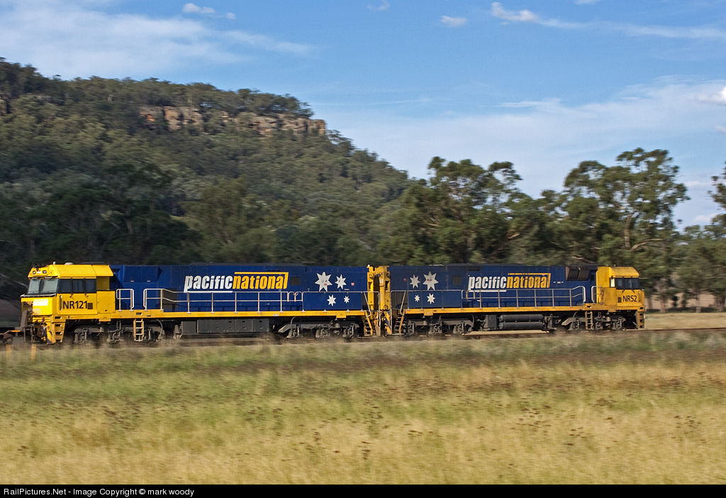 NR52-NR121 working an intermodal train that originated in South Australia to Brisbane Queensland detours via the Ulan line due to trackwork on the main north line.1/60 pan at track speed 70kph mainline through Wollar loop.