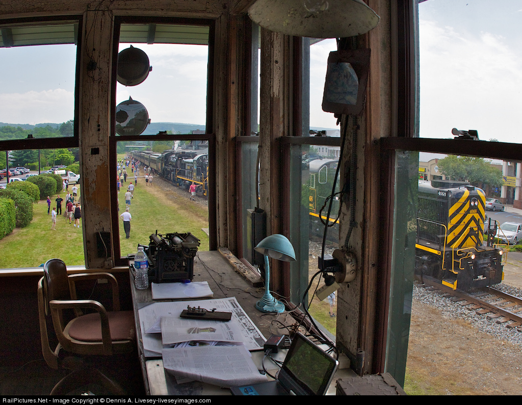 | Three DL RS-3's plus CN No. 3254 are powering the 2010 NRHS roundtrip excursion from Scranton to the Gap. The train is seen from the window of the last remaining wooden DL&W tower. Last used in 1986, it is in the good hands of the East Stroudsburg Railroad Tower Society. |