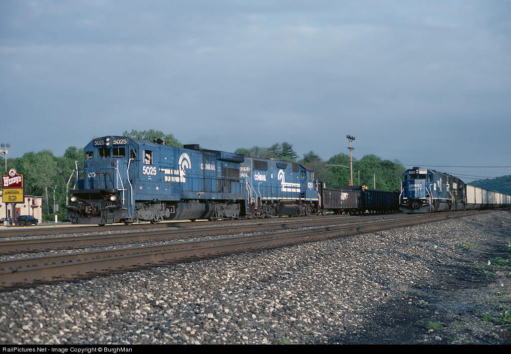| GE and EMD four axles team up to move a westbound train thru Leetsdale. Conrail was down to three weeks at this point. The SD50 on the right was already wearing its new NS number. |