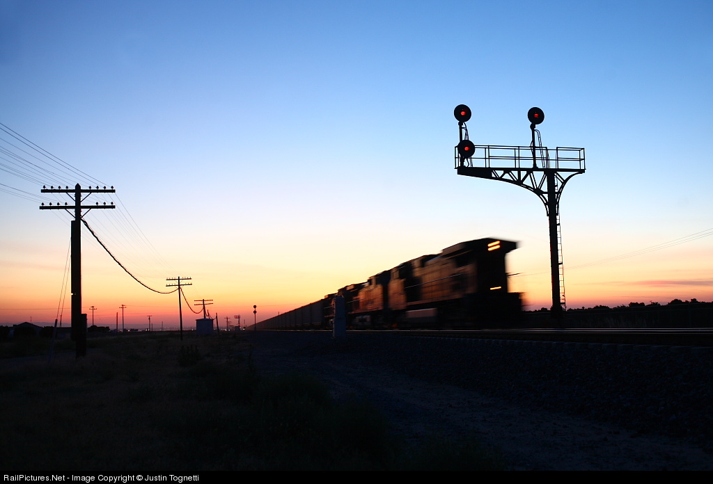 | The DPUs on a Wasco-bound coal train sail past the cantilever signal at Sandcut. This train is loaded in Utah and runs via UP's LA&SL mainline to Daggett where it enters BNSF trackage for the first time on its journey. |