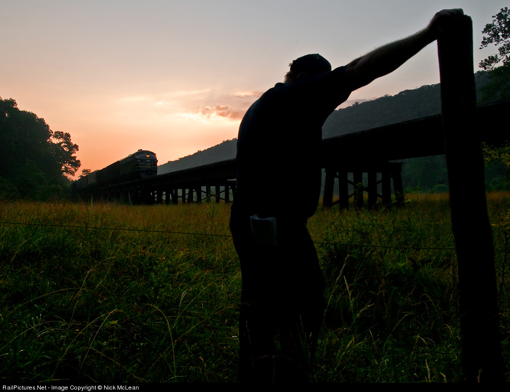 | As the sun prepares to rear its head over the ridges, a Potomac Eagle conductor takes a brief rest in the humid, steamy river bottom as he watches over his train's movement, waiting to see what us railfans will want next. Kudos to this gentleman for cooperating with a long day of runbys in the sweltering heat. A Lerro Productions Charter. |