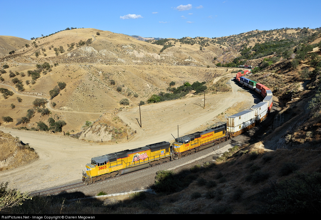A short Lathrop, CA bound stack train approaches Tunnel #3 between Cliff and Bealville, as it passes the remnants of Tunnel #4 visible in the shadow to the right of the train. Damaged beyond repair, during an earthquake in 1952, Southern Pacific decided to abandon the tunnel in favor of the current alignment.