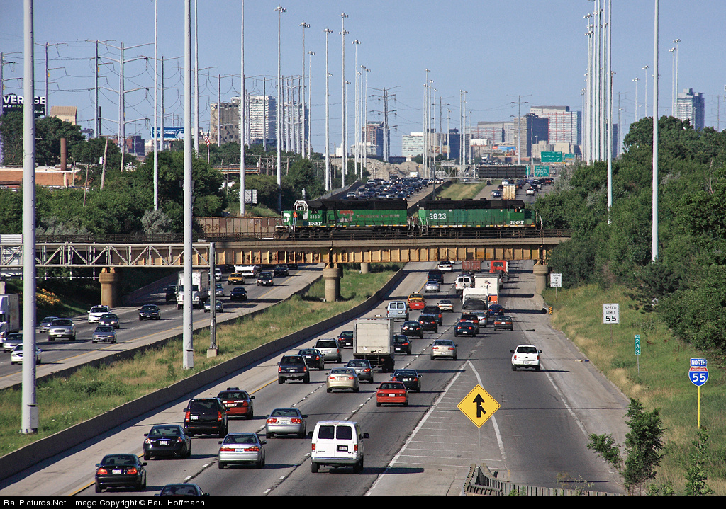 | What a ride!. A switchman rides the front porch of a couple of ex BN Geep's trundling across the Stephenson expressway to pick up a cut from the yard on the north side of he expressway. Outbound traffic on the left is picking up! |