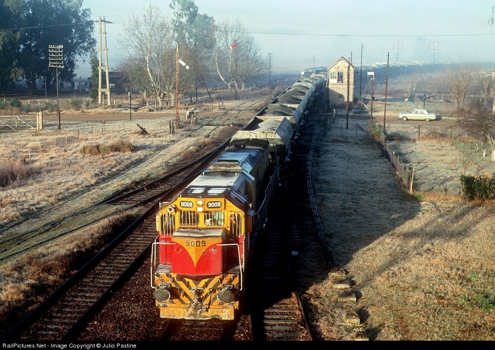 "Early on one frosty morning" was the heading of a long ago article in Trains Magazine, but the words rightfully apply to this scene of a Ferrosur Roca GM-EMD GT22CW entering Las Flores Yard from the south. Cold reigns at 8.00 a.m. in the chilly Winter morning, with below-zero temperatures, the ground and roofs of locomotive and cars covered with a thick frost, and the shadows of the train and signal posts cast long by the still low sun arising in the prairie horizon.