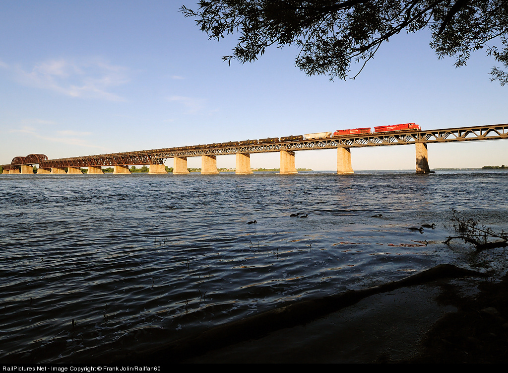 Having left Rouses Point N.Y earlier this morning, the empty ethanol train crosses the St. Lawrence River as it enters Montreal at sunrise.