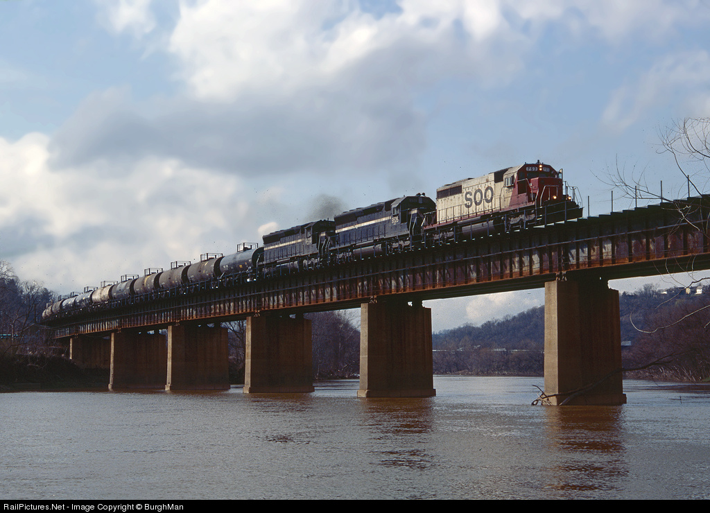 | During the 90's, sulfur train K868 regularly ran over CSX with Soo power. It is seen here crossing the Youghioghey River behind Soo SD40-2 753 and a pair of MK Rebuilt SD45's. |