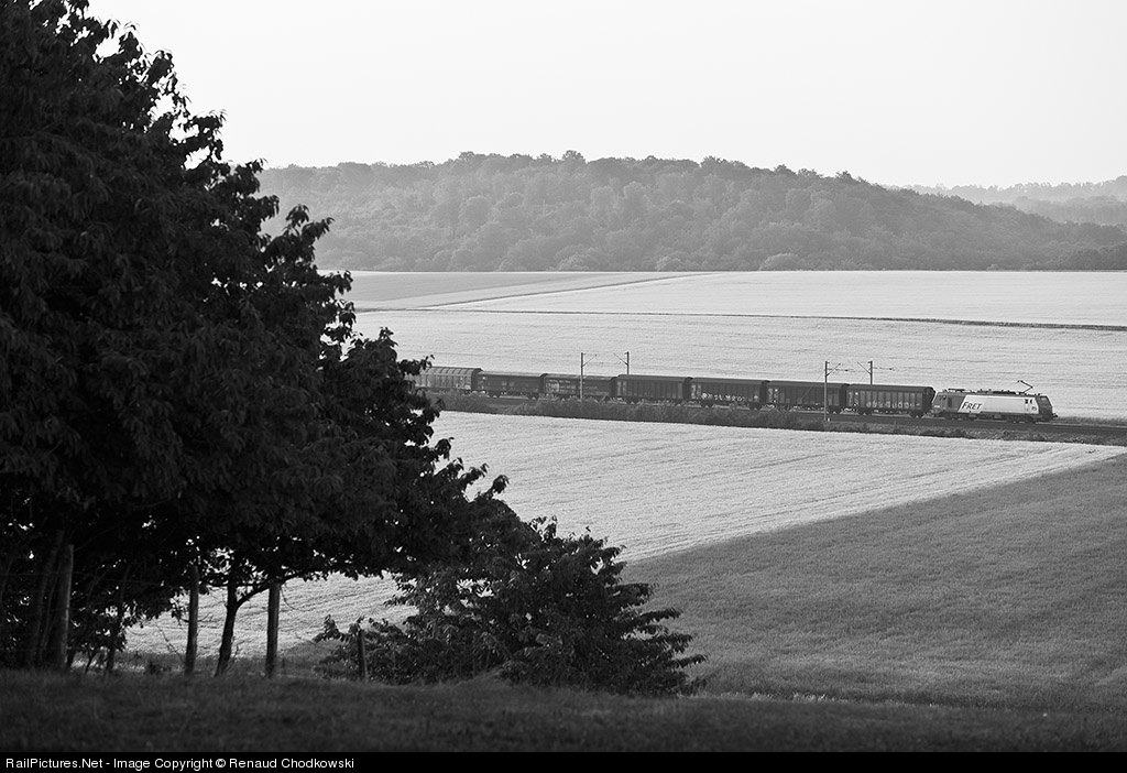 A low contrast b&w pic of a unit train behind an Alstom Prima BB 27000 ; Sony A900