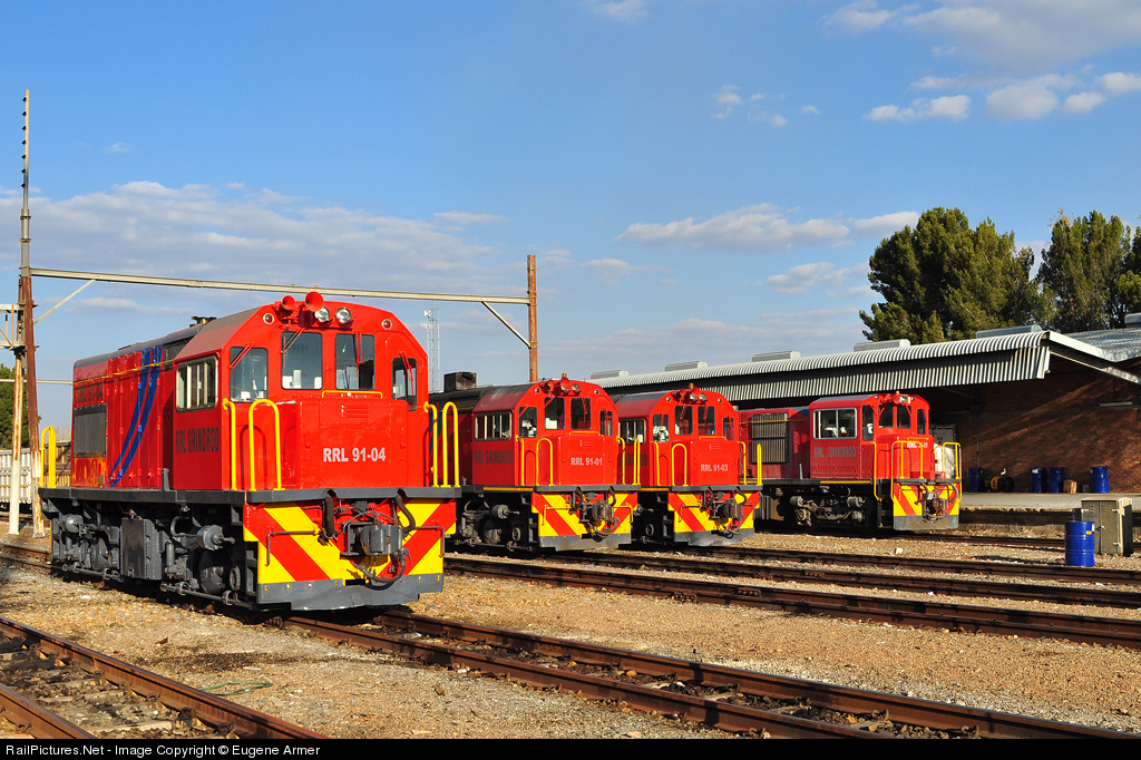 A late afternoon line-up of RRL Grindrod locomotives at Transnet Freight Rail’s (TFR) Welkom station, from left to right. 91-04, 91-01, 91-03 and 36-01. The class 91’s were built by GE and imported from the USA in the 1970’s for the 610mm (2’0”) gauge line from Port Elizabeth to Avontuur, home of the famous Apple Express (see photo ID 328605). With the line seeing little traffic these days, some of these loco’s were up for sale and have ended up here, working on 1067mm (3’6”) gauge. Their original bogies were widened to accommodate the change in gauge. The class 36 is an ex-TFR class 36-200 (EMD SW1002)
