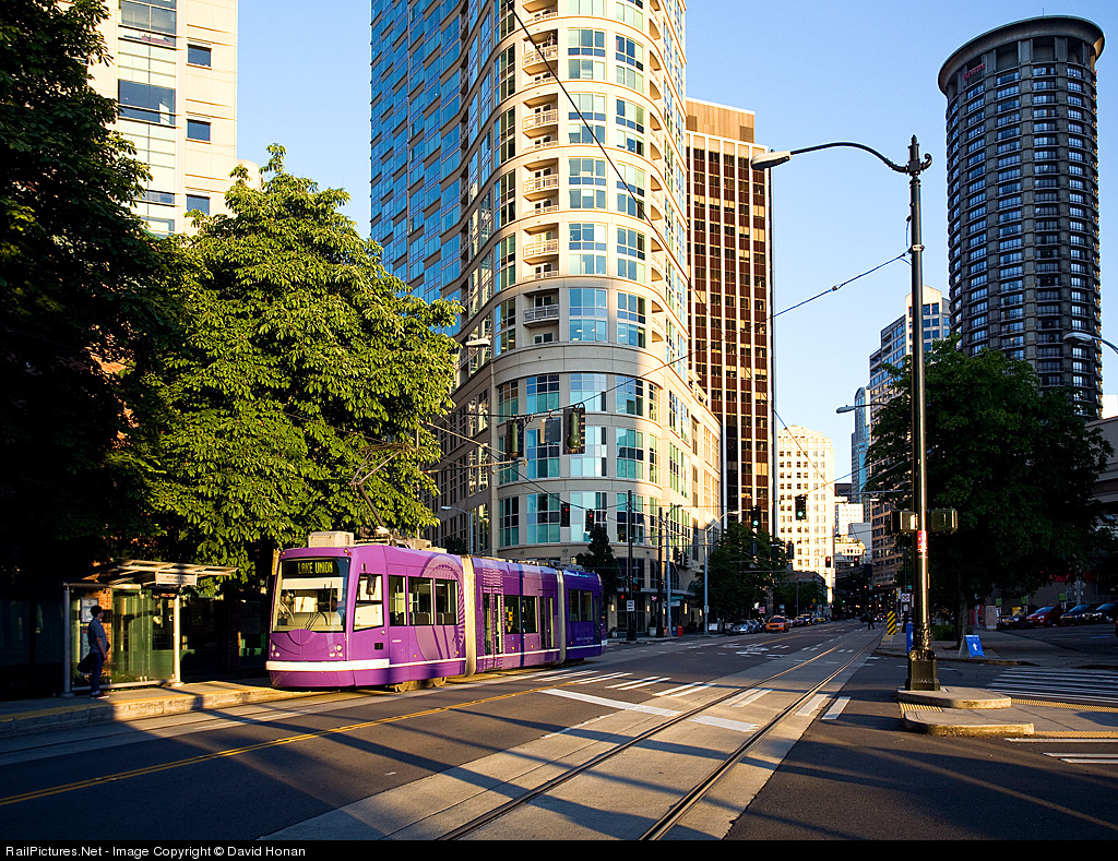 Long shadows are cast across downtown Seattle during the last minutes before sunset as the purple streetcar begins yet another trip to South Lake Union.