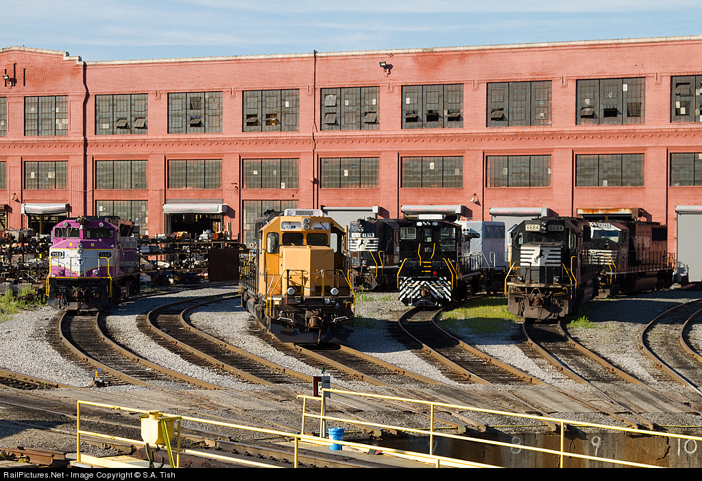 | It's an all EMD collection at the E&M shop with everything from an MBTA GP40MC in for rebuild at left to a SD40-2 with a new low cab to a Progress Rail SW1500 |