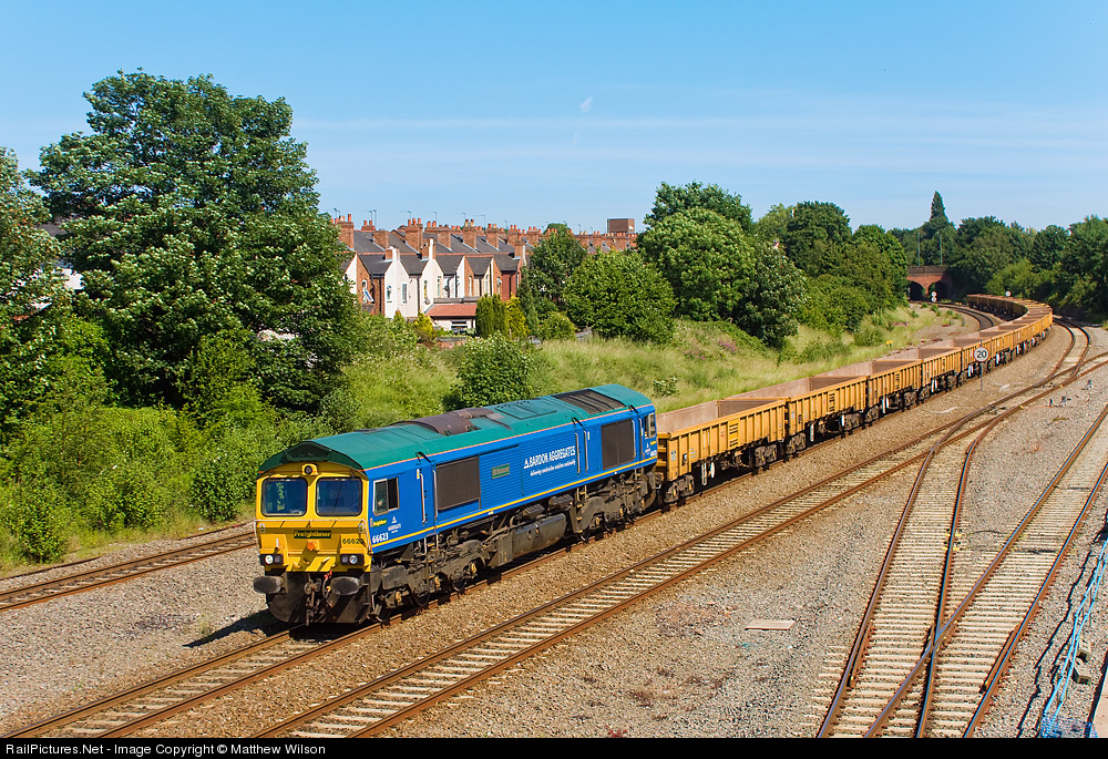 | Freightliner only operate two Class 66 locos in 'customer livery' out of their entire fleet. 66623 received Bardon Aggregates adornment in recognition of Freightliners appreciation at the award of a contract formerly held by EWS. The loco is seen heading empty ballast wagons from Westbury back to the East Midlands |