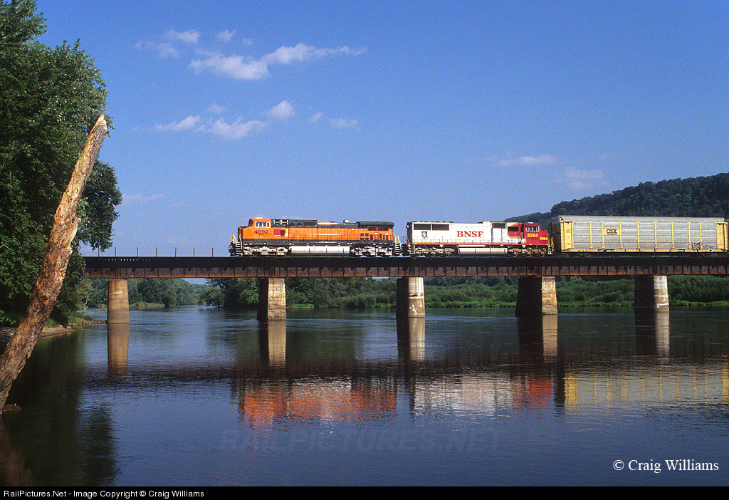 With the 268 Dash 9's delivered to the BNSF in 1998, GE got alittle behind on painting units, so some units came out without lettering. Here one of those Dash 9's lead a westbound auto rack train across the Wisconsin River Bridge south of Prairie. The train is 67 miles from LaCrosse, WI, next crew change.