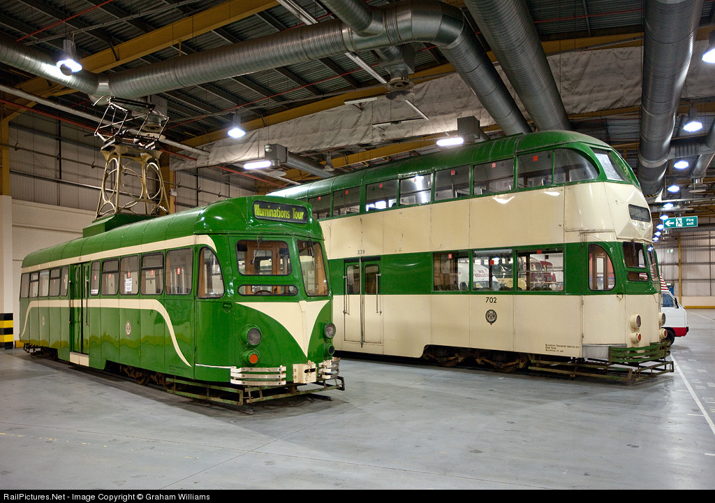 In 2009, Blackpool Tramway sold off a number of its old trams. Most went to museums. These two are amongst them. 623 is a 1937 single deck car built by Brush and 702 is a Double Deck "Balloon" car built in 1934. They belong to the Heaton Park Tramway, based in a large public park in Manchester running on original track that was laid there by Manchester Corporation over 80 years ago. At the moment, they are on display at the new Museum of Museums in Trafford Park, Manchester. This museum contains samples of collections from various museums. At the moment, the emphasis is on transport and football.- A strange combination.