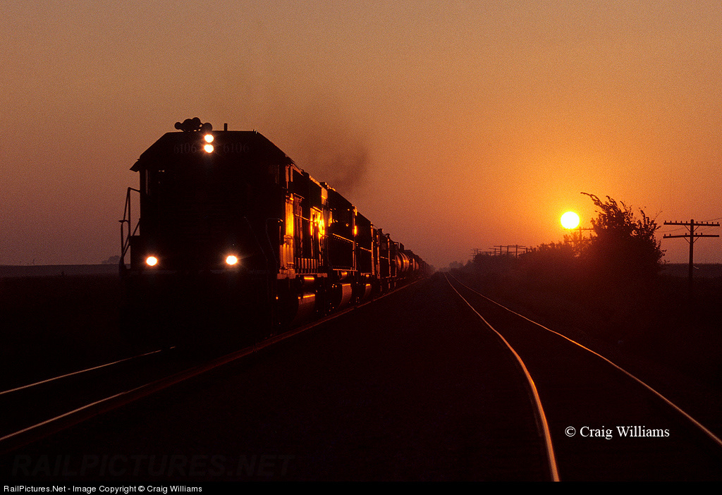 Westbound charges thru Beth Siding at sunrise. The train is on the Dubuque Sub between Dubuque and Waterloo, 35 miles east of Waterloo.