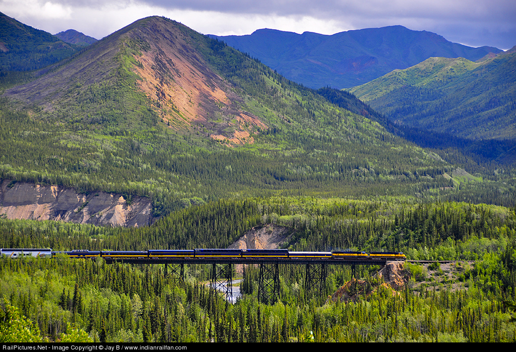 | Southbound Denali Star from Fairbanks to Anchorage has just departed from Denali National Park station on the Independence day. It is seen here crossing the Riley Creek Trestle just as the clouds part to bathe the valley in sunshine. |