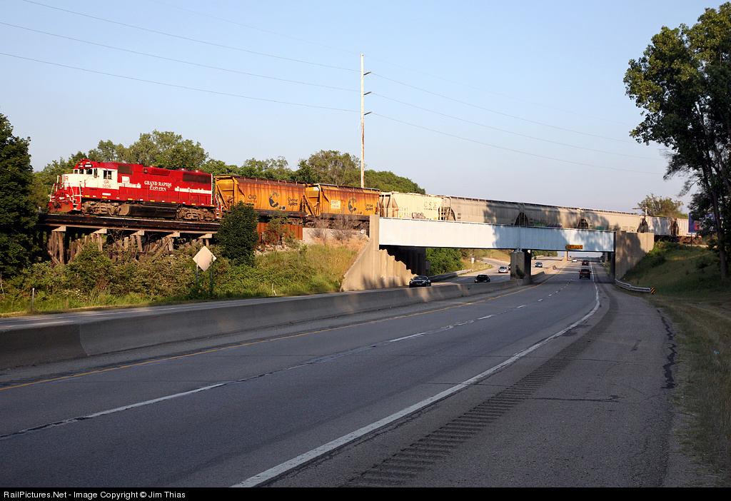 3839 is near the end of its job for the day, as it closes in on Mid Michigan Railroad's yard in Muskegon. Here we see the train crossing over the beginning of I-96, a cross-state highway that starts in Muskegon and ends in downtown Detroit, 192 miles to the east.